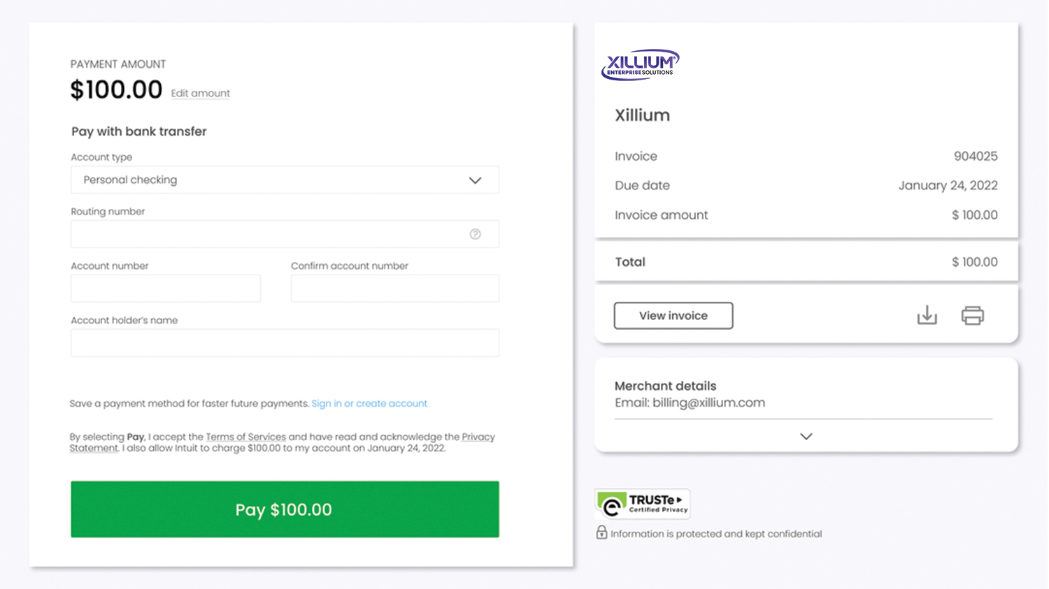 This section describes paying an invoice using Intuit’s Payment Network. You can enter your bank information manually or create an account with us for quicker payment. All information is handled in Intuit’s system and Xillium has no access to or control over your bank payments.